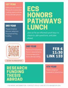 ECS Honors Pathways Lunch: Plan Ahead for Your Honors Journey! Navigating the Honors program can feel overwhelming — from research and funding to thesis planning and study abroad opportunities. That’s why the ECS Honors Program is hosting an Honors Pathways Lunch, an informal lunch-hour gathering on February 6 from 11:30AM in Link Hall 133 designed…