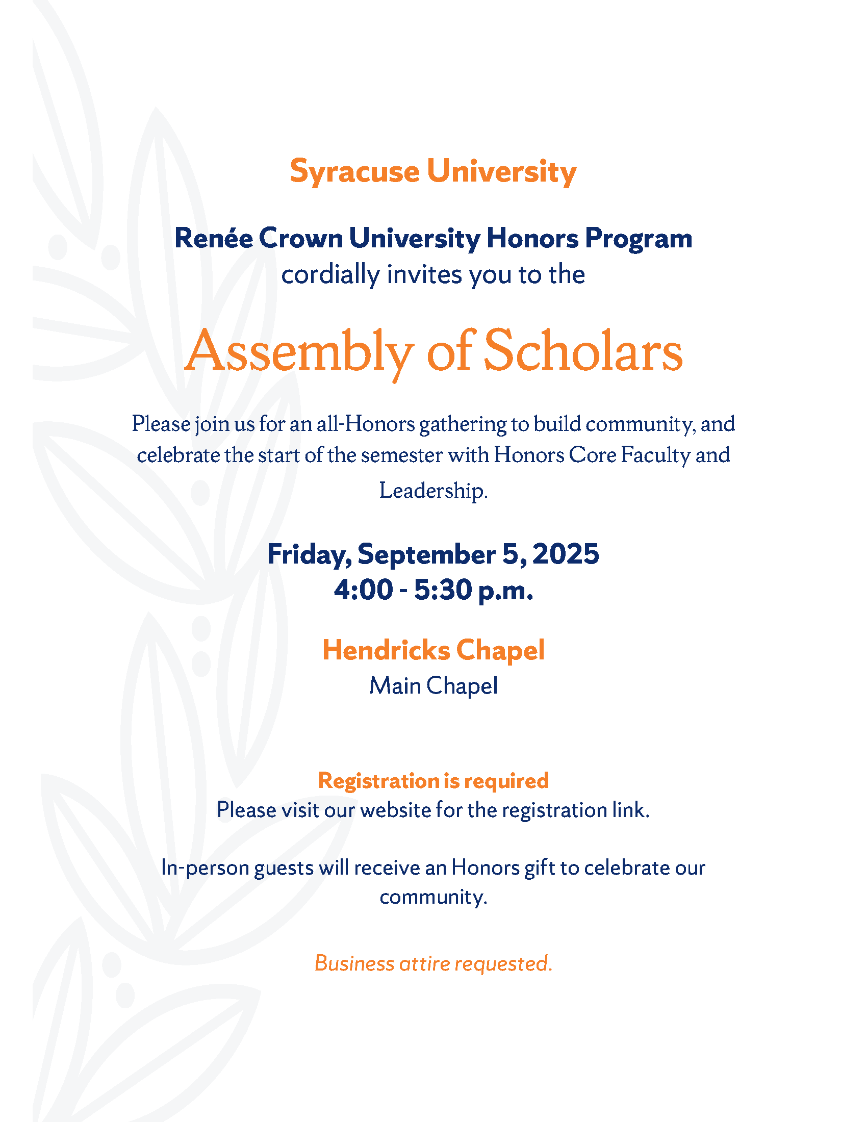 On Friday, September 5th from 4:00pm to 5:30pm, the Renée Crown University Honors Program is hosting an Assembly of Scholars in Hendricks Chapel. This event is an all-Honors meeting, where we will hear from Core Faculty and Honors on program updates. You will also have the chance to build your community while engaging with faculty, staff, and fellow Honors students. We understand Honors students have several cross-campus commitments; we hope to have you in attendance, but understand if other commitments conflict with the date and time.