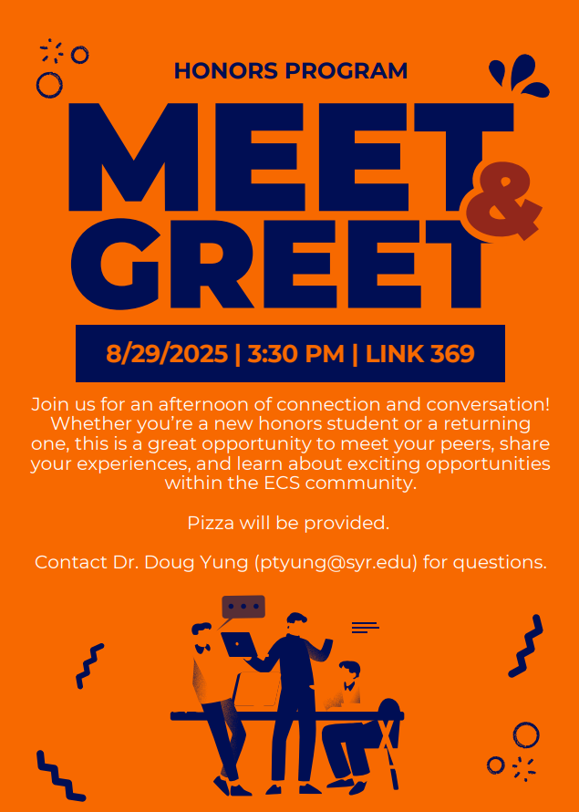 Whether you’re a new honors student or a returning one, this is a great opportunity to meet your peers, share your experiences, and learn about exciting opportunities within the ECS community. Pizza will be provided.