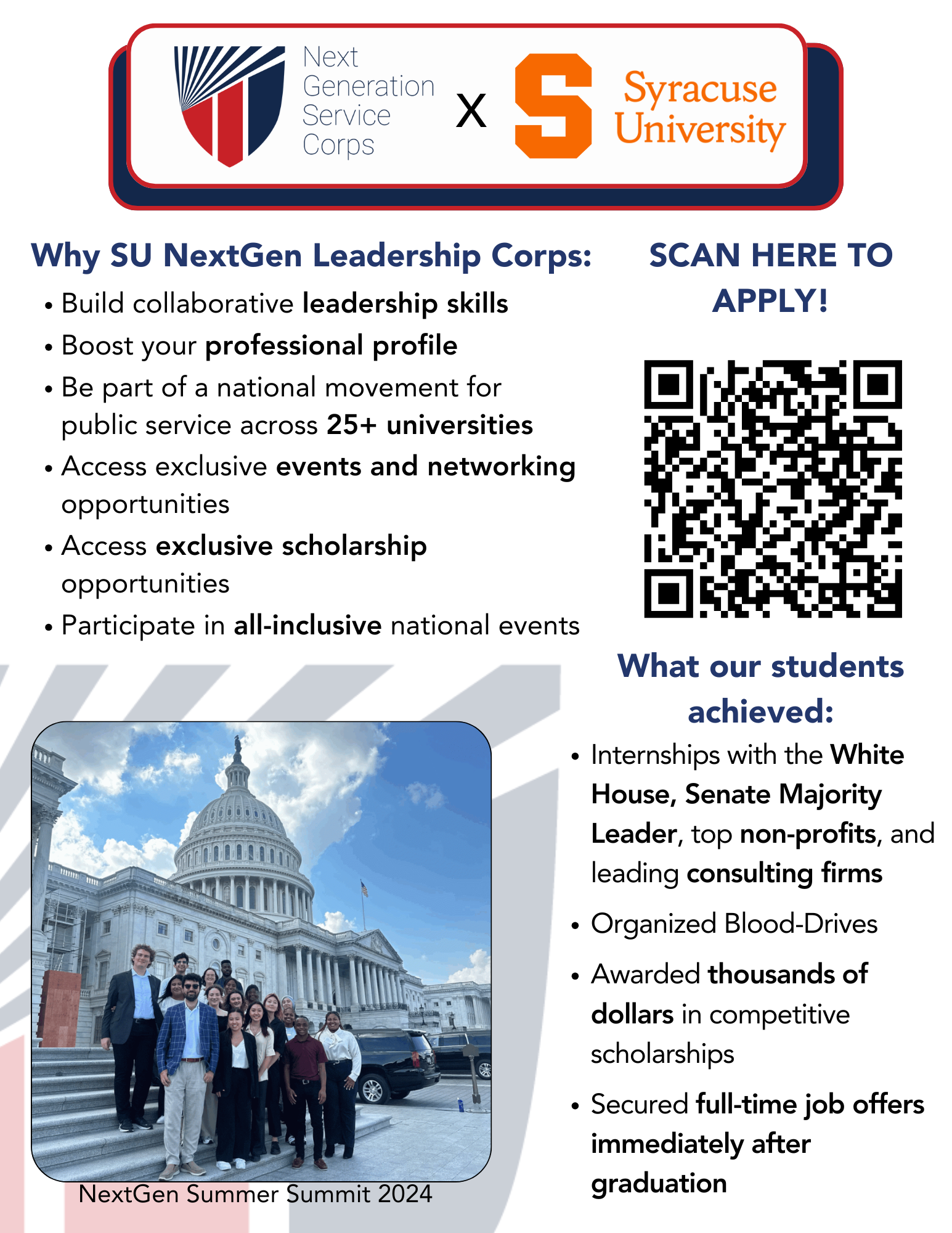 The SU NextGen Leadership Corps offers hands-on leadership experience, national networking, and exclusive opportunities in public service. Whether you’re passionate about civic engagement or looking to strengthen your resume, this program connects you with students from over 25 universities, provides access to scholarships, and opens doors to internships on the Hill to leading nonprofits.