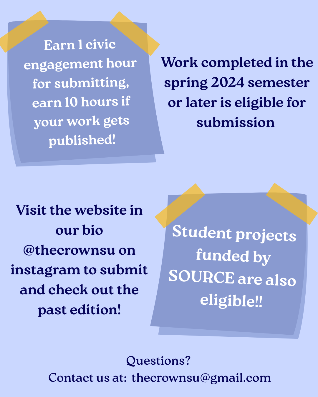Questions? Contact us at: thecrownsu@gmail.com