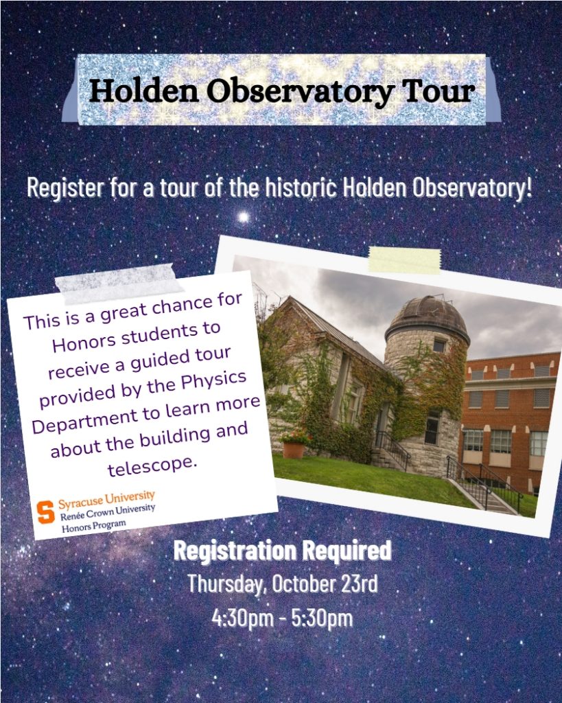 Holden Observatory is one of the oldest buildings on the Syracuse University campus. Explore this historic structure and learn about its fascinating past. Honors students will be guided by Syracuse Physics students. The tour will take you through the rich history of Holden Observatory, from its construction in 1887 to its relocation and preservation on campus. Whether you’re a history buff, a science enthusiast, or just curious about this hidden gem on campus, we invite you to join us.