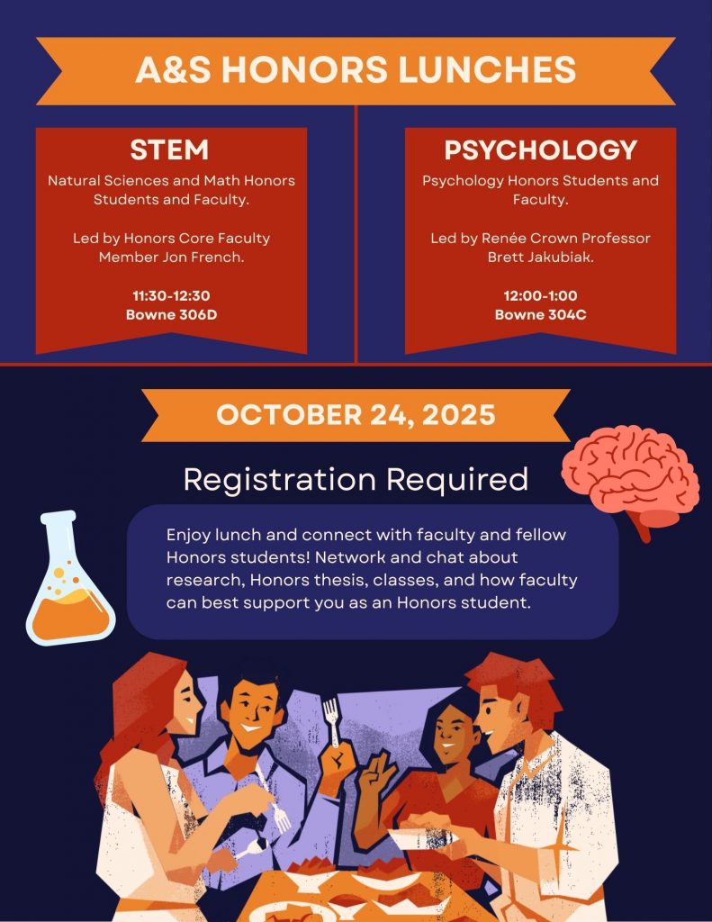 Looking to connect with faculty and fellow Honors students over good food and great conversation? Don’t miss the A&S Honors Lunches on Friday, October 24, 2025 in the Honors Suite.