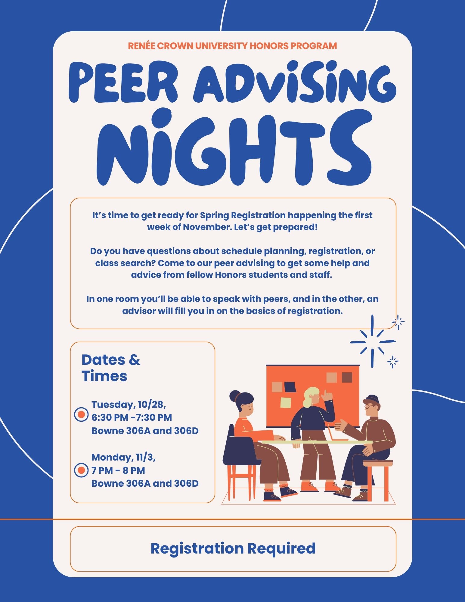 Do you have any questions about schedule planning, registration, or class search for Spring Registration? Join us on October 28th and November 3rd in 306 Bowne Hall for our Honors Peer Advising Nights!
