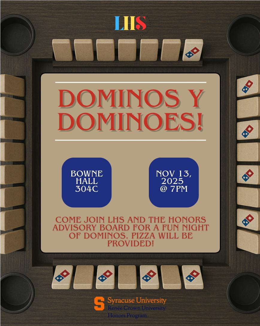 Join the Latiné Honors Society and the Honors Advisory Board on November 13 at 7PM in 304C Bowne Hall for a fun night of dominoes, pizza, and community! Come relax, connect, and enjoy a casual evening with friends before the semester wraps up.