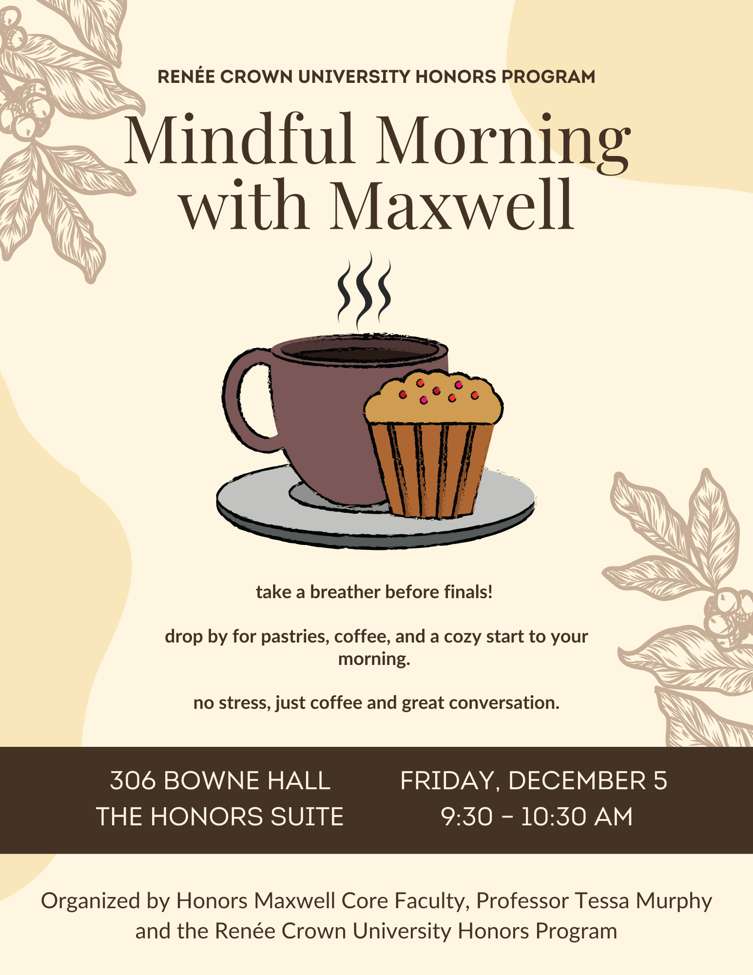 Join us for coffee, pastries, and conversation on December 5 at 9:30AM in 306 Bowne Hall for a relaxed morning break designed to help you recharge before the end of the semester. All Maxwell Honors students are warmly invited to drop by, unwind, and connect with peers and faculty in a cozy, welcoming space.