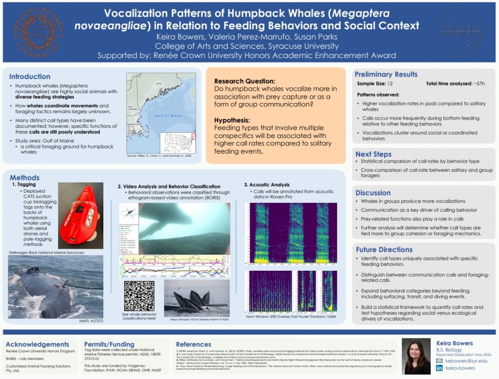 I used my summer funding to continue my Honors thesis research on humpback whale feeding behaviors. The support let me purchase the materials I needed and return to campus early, living in off-campus housing. Most of my time was spent analyzing biologging videos and annotating whale behaviors frame-by-frame using specialized software. This was one of my favorite parts of the entire project because it let me actually see the behavior I’d been studying on paper. Overall, the experience gave me a much deeper understanding of the species and helped me stay on track with my research timeline.