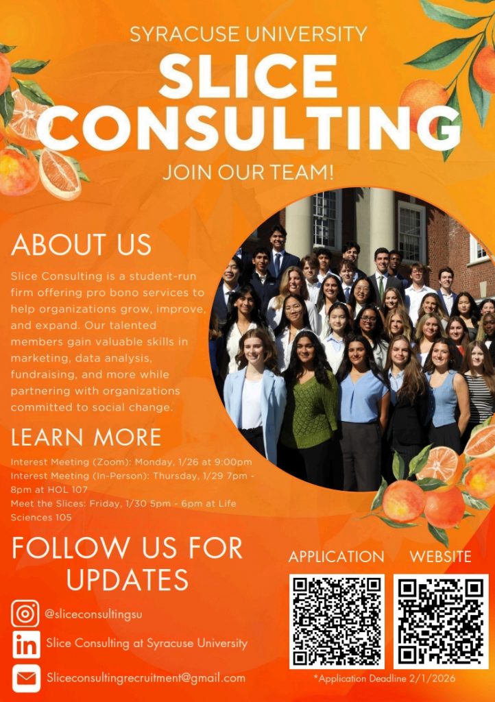 Slice Consulting is a student-run organization that allows students of all majors and years to transition classroom knowledge into meaningful work experience. In practice, Slice Consulting offers both local and national businesses and nonprofits the opportunity to work on a short-term project with a team of students to help advance their business through skill sets such as data analysis, marketing, fundraising, brand kit development, and more. Along with projects, Slice Consulting also offers students professional development workshops during their weekly meetings. For more information about the organization, please click here.