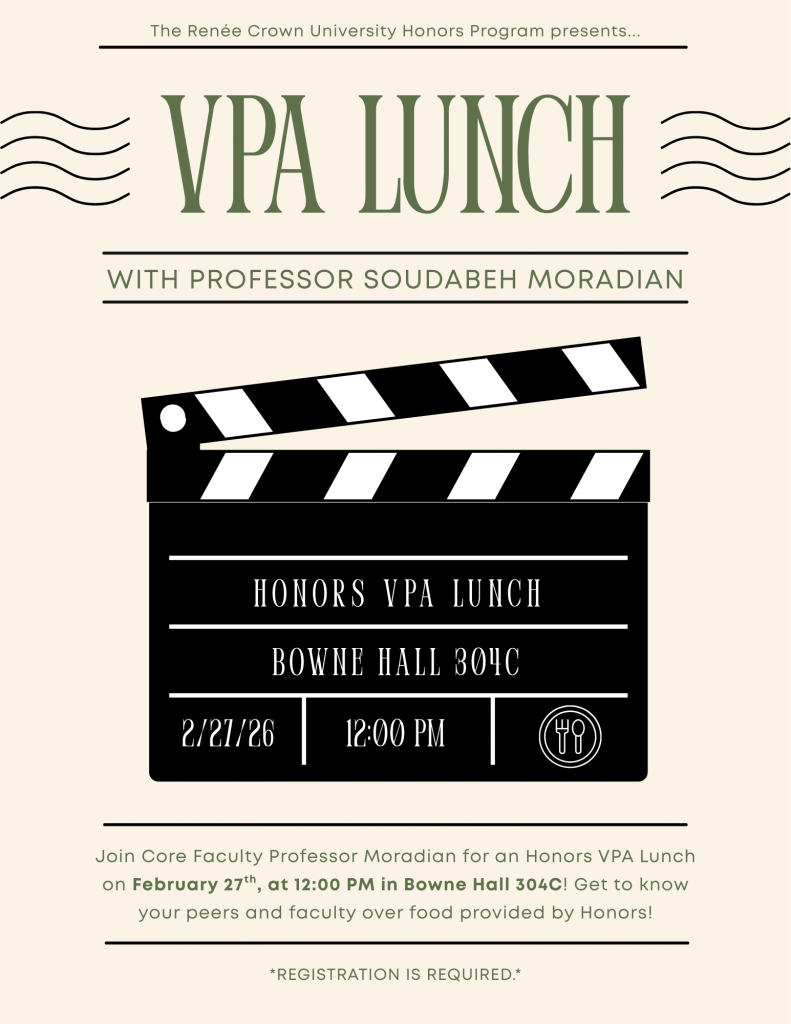 Calling all Honors students in the College of Visual and Performing Arts! Honors Core Faculty Professor Soudabeh Moradian will be hosting an Honors VPA Lunch on Friday, February 27th at 12:00 PM in Bowne Hall 304C. This is an opportunity to discuss research, plan your journey, and ask questions – all with some good food provided by Honors.