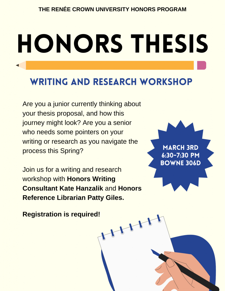 Are you a junior wondering about what the thesis writing process might look like or what library resources are available for you as you embark on this journey? Are you a senior who needs some pointers on your writing or research as you navigate the writing process this Spring?