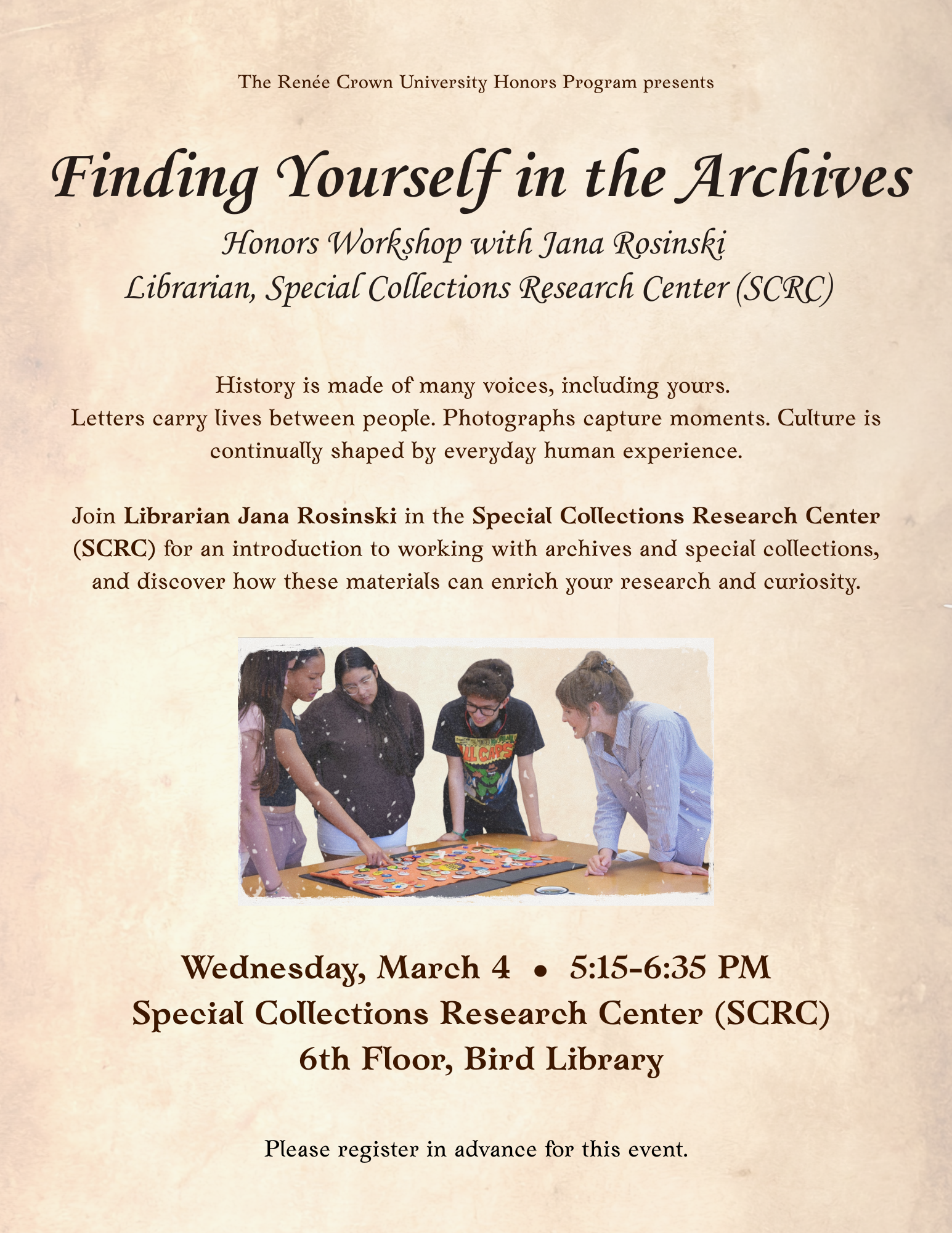 Join Librarian Jana Rosinski on March 4 from 5:15-6:35 PM in the Special Collections Research Center on the 6th floor of Bird Library for an Honors Workshop introducing you to the world of archives and special collections.