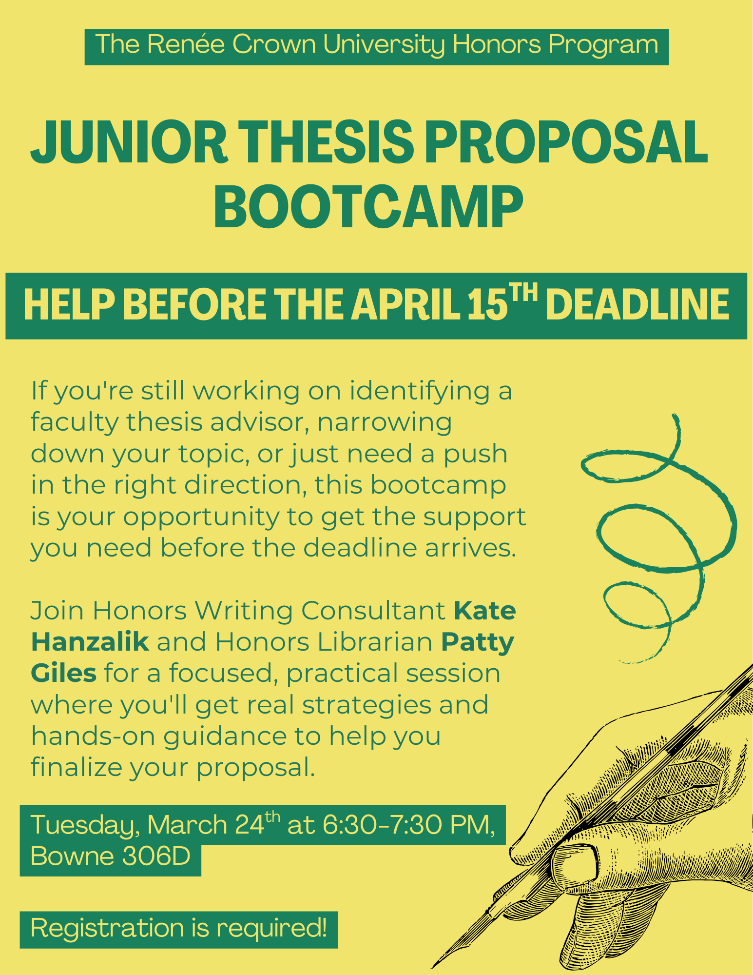 Join Honors Writing Consultant Kate Hanzalik and Honors Librarian Patty Giles for a focused, hands-on session to help you finalize your proposal before the deadline.