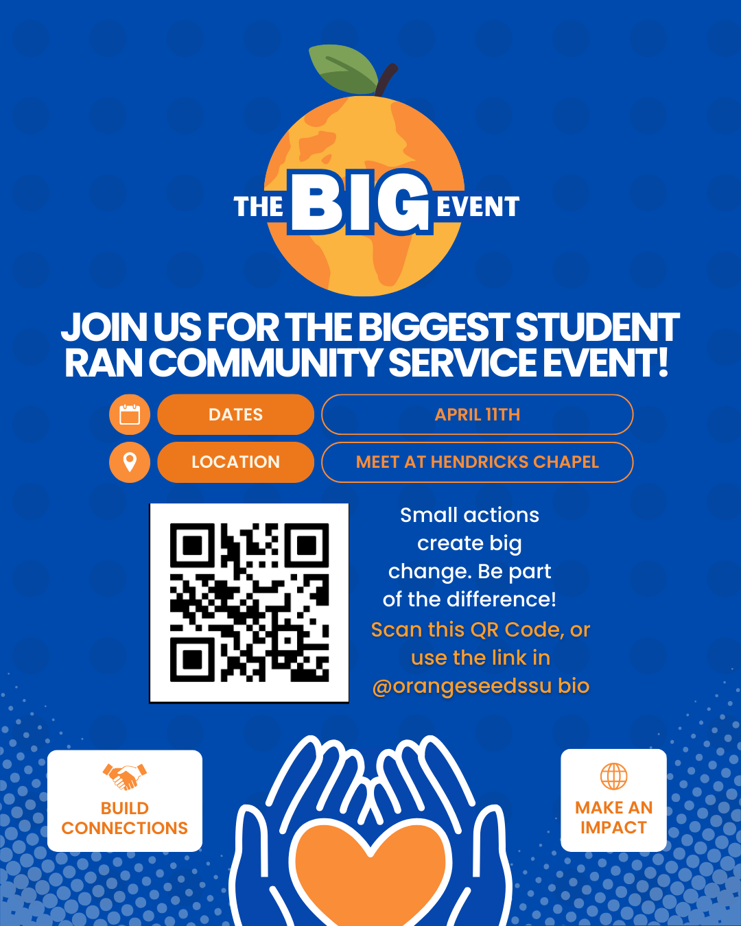 The Big Event, Syracuse University’s largest student-run community service event, will take place on April 11thCheck-in begins at 10:30 AM at Hendricks Chapel, and service projects will run until about 4:00 PM.