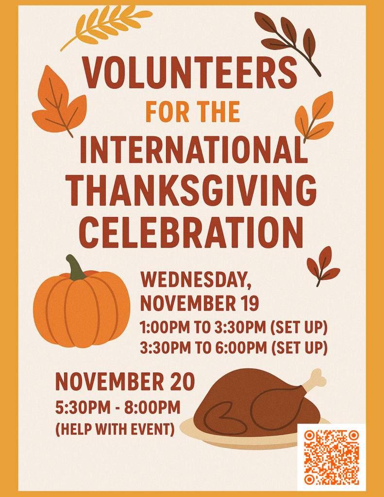 Join the Center for International Services in spreading gratitude and global community spirit! The Center for International Services is hosting International Thanksgiving on Thursday, November 20th, and they are looking for volunteer help. Help with event setup on November 19 or during the celebration on November 20.