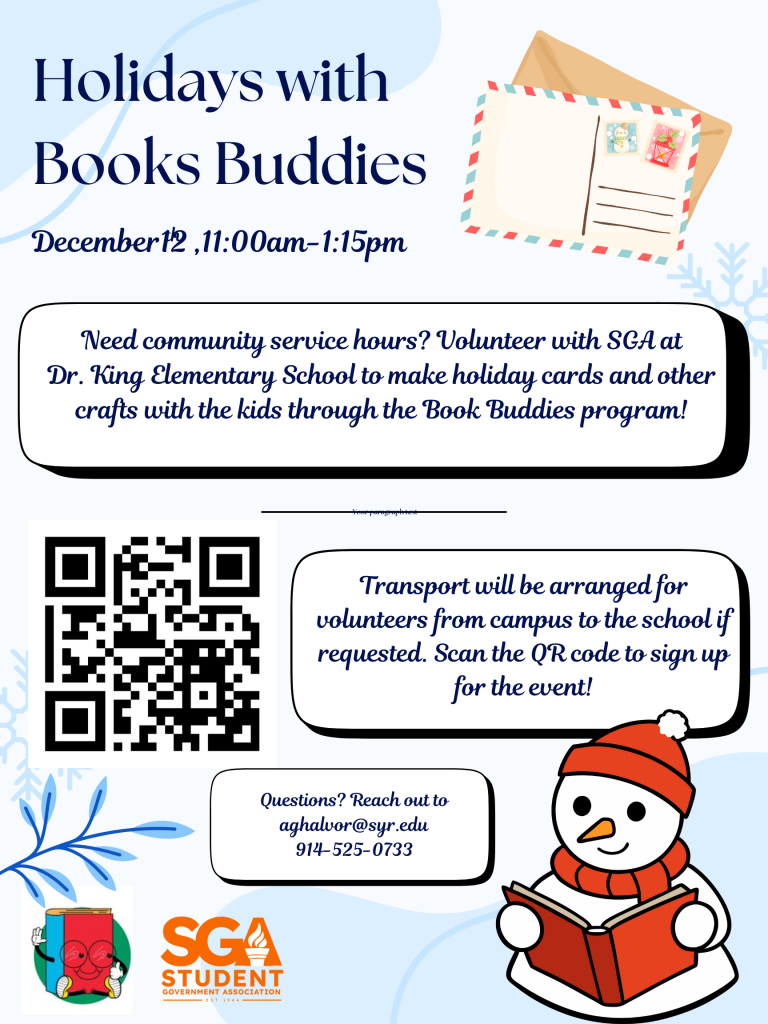 The Community and Government Affairs Committee of the Student Government is hosting a volunteering event in partnership with Book Buddies on December 12th from 11:00AM – 1:15PM at Dr. King Elementary School. SU student volunteers will make holiday cards and other arts and crafts with the kids. Transportation to the school will be arranged beforehand.
