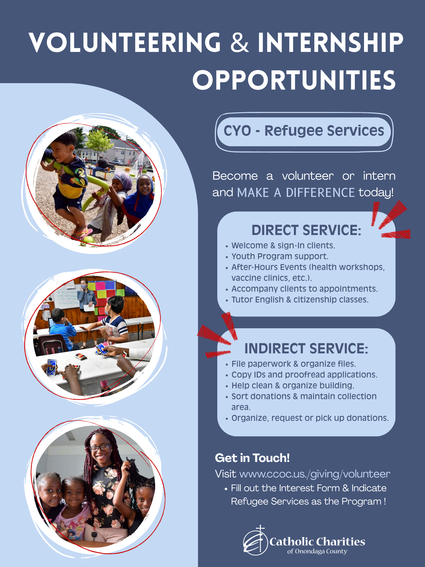 Are you staying in Syracuse for the summer? The CYO is looking for interns and volunteers for their refugee services programs. You will have the opportunity to work in direct or indirect services. This is a great way to make a difference in your local community and gain civic hours over the summer!