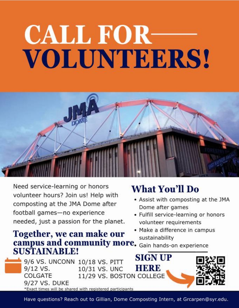 Volunteers Needed for JMA Dome Composting Program Syracuse University Sustainability Management Team is looking for volunteers to assist with the Dome Composting Program at the JMA Wireless Dome following home football games. Volunteers will help collect compostable materials from the stands and concourses, supporting our efforts to divert waste from landfills and advance the University’s…
