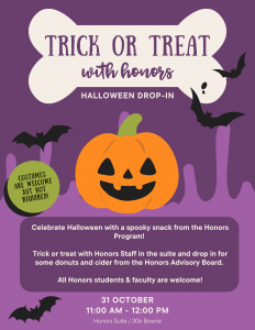 Trick or Treat with Honors Join us on October 31st in the Honors Suite in 306 Bowne Hall for our Halloween pop-up event from 11AM to 12PM. Come in a costume or just be yourself and enjoy some spooky snacks with the Honors Staff! For any questions, please contact honors@syr.edu.