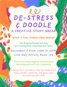 De-Stress & Doodle: A Creative Study Break for ECS Students Feeling the mid-semester crunch? Take a mindful pause with Professors Povinelli and Yung at the De-Stress & Doodle event, a creative study break designed to help you recharge and rediscover your imagination. When: November 7, 11 AM – 12 PMWhere: Link Hall Atrium, Room 135…