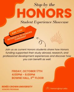 Honors Student Experience Showcase Join us for the Honors Student Experience Showcase at the 3rd Floor in Bowne Hall on Friday, October 17 from 4PM to 6PM. Current Honors students will be sharing how Honors funding supported their various endeavors, like study abroad, research, and professional development experiences. This is your chance to discover how…
