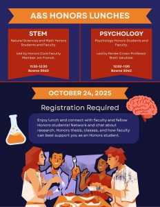 A&S Honors Lunches (STEM and Psychology) Looking to connect with faculty and fellow Honors students over good food and great conversation? Don’t miss the A&S Honors Lunches on Friday, October 24, 2025 in the Honors Suite. This is a great opportunity to build relationships, discuss research, and explore your academic journey in a relaxed, friendly…