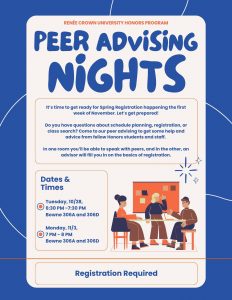Honors Peer Advising Nights Do you have any questions about schedule planning, registration, or class search for Spring Registration? Join us on October 28th and November 3rd in 306 Bowne Hall for our Honors Peer Advising Nights! If you would like to get civic engagement hours, come join us to be an Honors peer on…