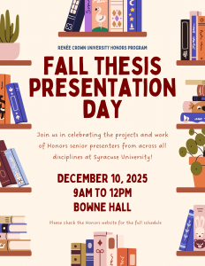 Fall Thesis Presentation Day Join us on December 10 from 9AM to 12PM in Bowne Hall to celebrate the projects and work of Honors senior presenters from across all disciplines at Syracuse University. Fall Thesis Presentation Schedule can be found here.